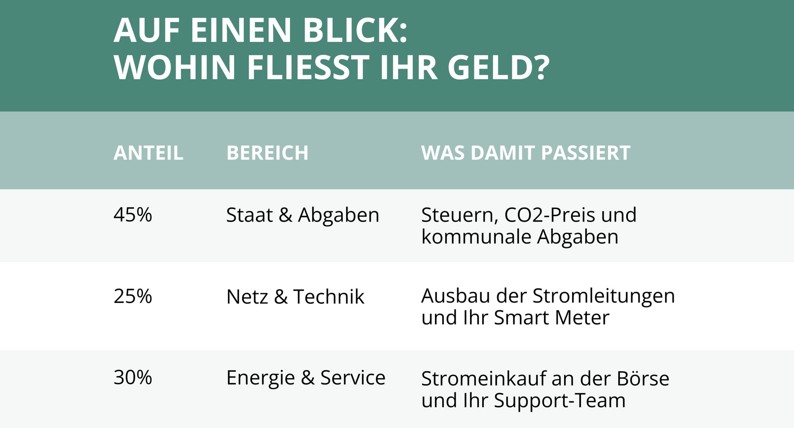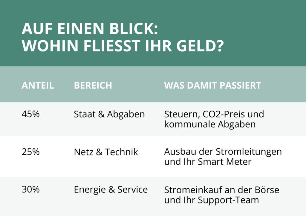 Fast die Hälfte Ihres Geldes geht direkt an den Staat. Dazu gehören die Mehrwertsteuer, die Stromsteuer und verschiedene Umlagen. Wir fungieren hier quasi als „Inkassobüro“ für das Finanzamt und die Behörden.
